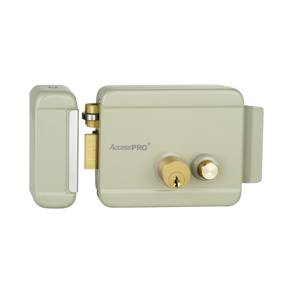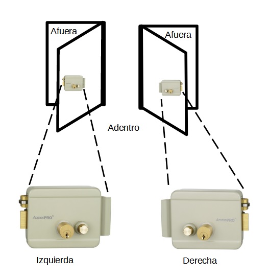 Cerradura eléctrica Accesspro lado izquierdo, diseñada específicamente para puertas que abren hacia adentro. Compatible con sistemas de control de acceso de las principales marcas como ZKTeco, Hikvision, Dahua, Kocom, Commax y más.